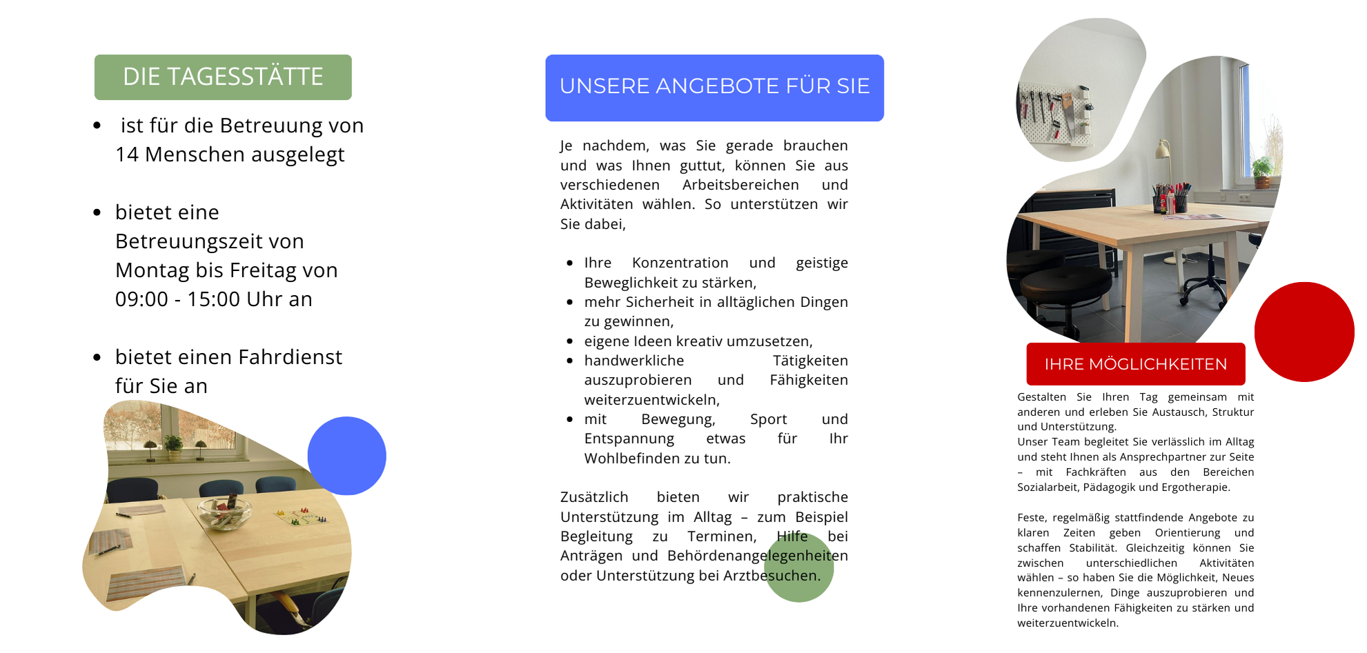 Im Rahmen eines verlässlichen, tagesstrukturierenden Angebots begleiten wir Sie dabei, Stabilität zu gewinnen, persönliche Ressourcen zu stärken und soziale Teilhabe zu fördern. In einem geschützten Rahmen bieten wir Raum für Begegnung, Austausch und Orientierung – mit dem Ziel, Selbstständigkeit zu erhalten bzw. schrittweise auszubauen.